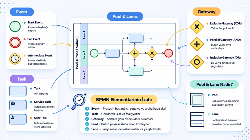 BPMN-in gücü onun sadə, amma standartlaşdırılmış vizual elementlərindədir. Bu elementlər həm qeyri-texniki, həm də texniki insanlar üçün intuitivdir.
