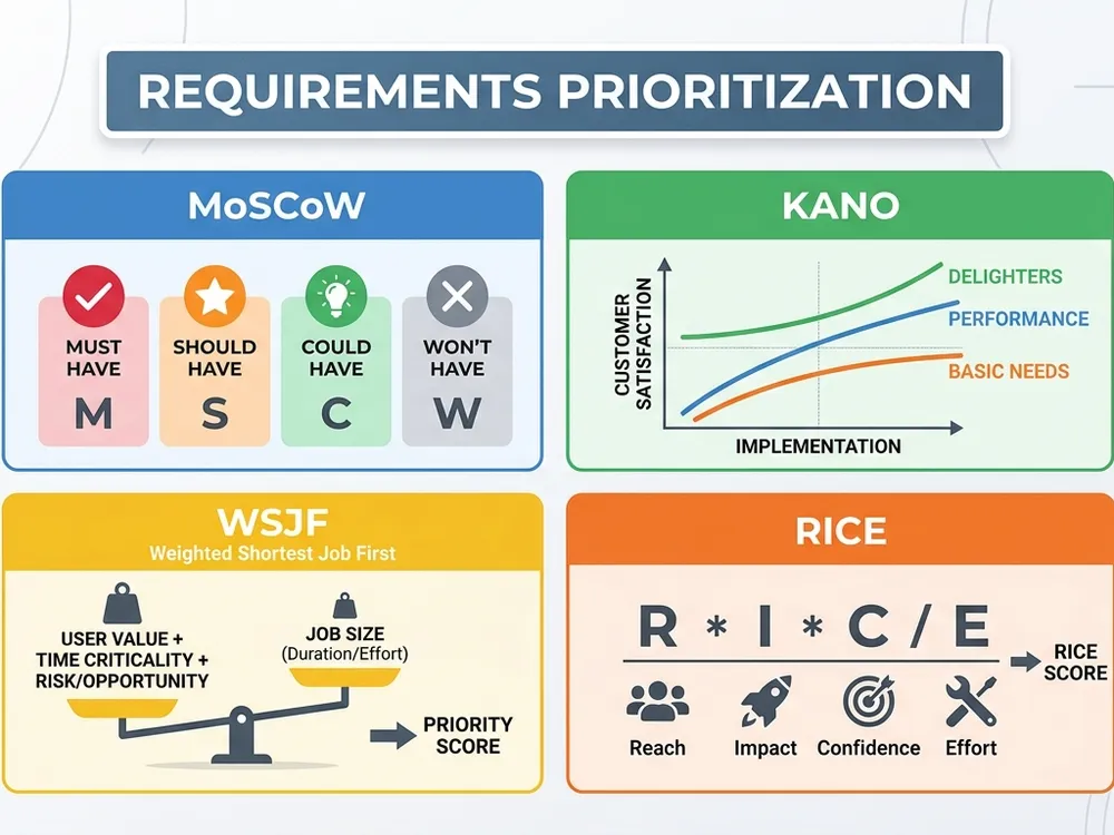 Bu dərsdə tələblərin prioritetləşdirilməsi üçün ən geniş istifadə olunan yanaşmaları – MoSCoW metodu, KANO modeli, WSJF və RICE score metodlarını praktiki baxımdan izah edəcəyik və onların real layihələrdə necə tətbiq olunduğunu göstərəcəyik.